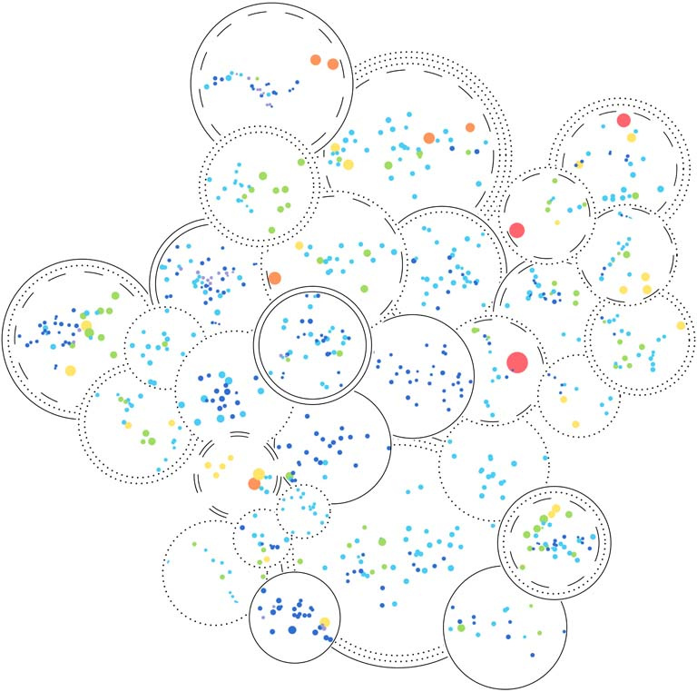 These symbols are a way to visualize the extent of diversity within stem cell colonies using data collected from time lapse imaging. Each symbol represents a different colony after four days of growth, and the colored dots within each symbol represent the size and position of individual cells within that colony. The color of the individual cells represents their generations, with red representing first-generation (old) cells, orange representing second-generation cells, yellow representing third-generation cells, and so forth through violet representing seventh-generation (young) cells. The number of rings encircling each colony represent the number of cells the colony came from, and the pattern of the rings represents how fast those originating cells grew (solid line = fast-dividing cell, dotted line = moderate-dividing cell, and dashed line = slow-dividing cell).