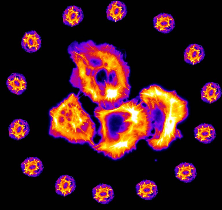 We are studying the effect of differential protein levels of the oncogene, Kras, on the cells’ properties such as migration, adhesion and skeleton arrangement. In the images shown in this collage, we imaged the skeleton of pancreatic cancer cell lines exhibiting low levels of Kras. Here the skeleton appears very spiky, with tight bundles. The skeletons from cells with high levels look very different. With such an experiment we could show that different levels of Kras affect the arrangement and shape of the cells’ skeleton.