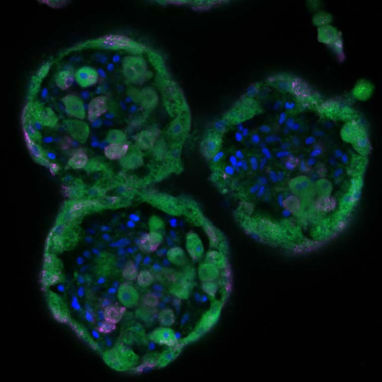 This image shows mini engineered livers comprising hepatocytes (liver cells) and supporting stromal cells within a macroporous 3D matrix. One bottleneck in the development of antimalarial drugs and vaccines is the lack of cost-effective and reproduceable human-based disease models for screening. This image of liver spheroids is part of a project that proposes to develop engineered liver tissues that support long-term hepatocyte survival and function to study microenvironmental factors for Plasmodium parasite traversal into the human liver and enable robust malaria infection.