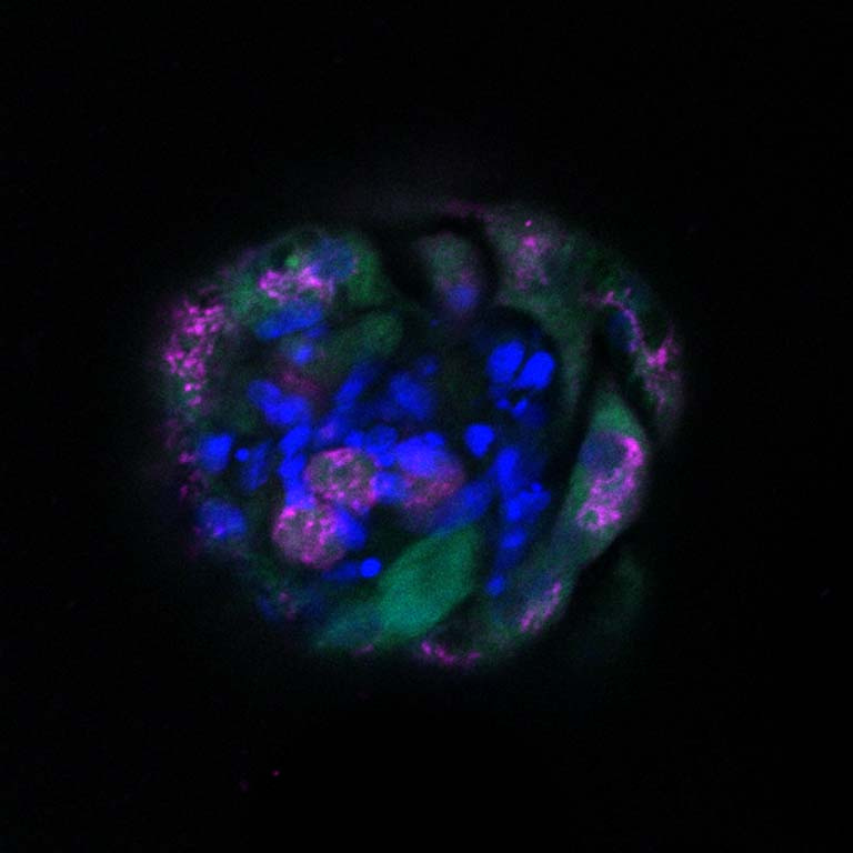 This image shows mini engineered livers comprising hepatocytes (liver cells) and supporting stromal cells within a macroporous 3D matrix. One bottleneck in the development of antimalarial drugs and vaccines is the lack of cost-effective and reproduceable human-based disease models for screening. This image of liver spheroids is part of a project that proposes to develop engineered liver tissues that support long-term hepatocyte survival and function to study microenvironmental factors for Plasmodium parasite traversal into the human liver and enable robust malaria infection.