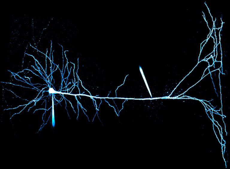 This is an image of a brain cell (neuron). The cell body (spherical structure near the bottom) possess long branched processes, called dendrites. The two thick triangular shapes are electrodes to assess the electrical properties of the neuron.