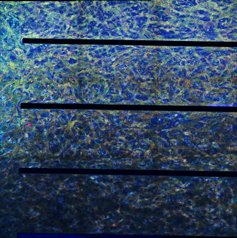 We are developing implantable chips that can carry engineered organoids and allow them to survive inside the human body. Shown in this example, we have been able to differentiate stem cells into neurons within our devices. The neurons spontaneously form a dense mesh-like structure inside the device like those seen in brain tissues. These devices demonstrate the potential to use implantable devices for the treatment and study of neurological conditions and psychiatric diseases. We took this image to monitor our ability to grow and different stem cells into neurons while in our devices. We also wanted to demonstrate cell viability over time.