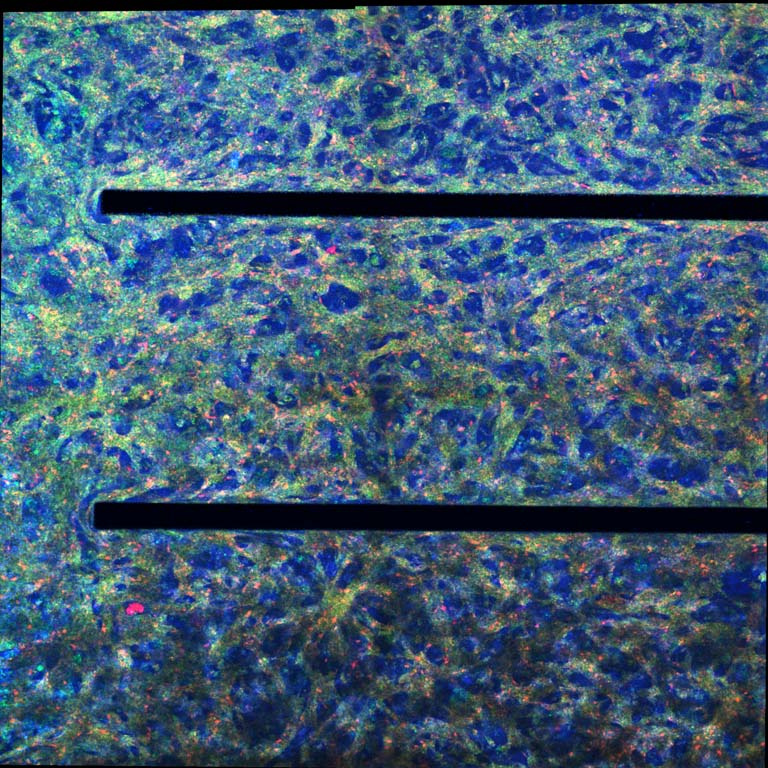 We are developing implantable chips that can carry engineered organoids and allow them to survive inside the human body. Shown in this example, we have been able to differentiate stem cells into neurons within our devices. The neurons spontaneously form a dense mesh-like structure inside the device like those seen in brain tissues. These devices demonstrate the potential to use implantable devices for the treatment and study of neurological conditions and psychiatric diseases. We took this image to monitor our ability to grow and different stem cells into neurons while in our devices. We also wanted to demonstrate cell viability over time.