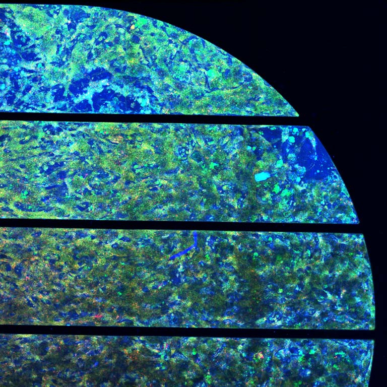 We are developing implantable chips that can carry engineered organoids and allow them to survive inside the human body. Shown in this example, we have been able to differentiate stem cells into neurons within our devices. The neurons spontaneously form a dense mesh-like structure inside the device like those seen in brain tissues. These devices demonstrate the potential to use implantable devices for the treatment and study of neurological conditions and psychiatric diseases. We took this image to monitor our ability to grow and different stem cells into neurons while in our devices. We also wanted to demonstrate cell viability over time.