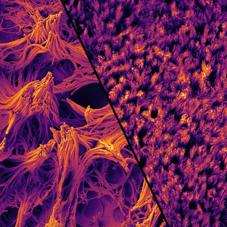 Through air-liquid interface culturing, we can generate human airway epithelium in the laboratory from healthy donor or patient airway stem cells. We applied this technology alongside modern molecular biology and imaging techniques to unravel the biological basis of a previously uncharacterized genetic lung disease. This depicts a normal human airway by electron microscopy (left) contrasted to an image obtained of the same sample using a high-power light microscope (right).