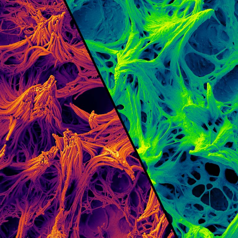 Through air-liquid interface culturing, we can generate human airway epithelium in the laboratory from healthy donor or patient airway stem cells. We applied this technology alongside modern molecular biology and imaging techniques to unravel the biological basis of a previously uncharacterized genetic lung disease. This image depicts human airway grown in a dish from 2 donors – the first a normal person (red) and the second (green) a patient with a severe genetic lung disease which we isolated to a problem with the development of cilia.