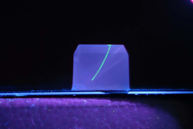 Better understanding and treating brain disease requires the use of complex tools to investigate its activity. Current devices are often bulky and damage the brain, but this damage and scarring can be minimized by implanting smaller devices, like a microcapillary. Polishing flexible microcapillaries to specific angles causes them to curve due to net forces upon implantation. This allow the implant to avoid important structures and reach a desired target like a brain tumor or seizure focus. Here we demonstrate the use of steerable glass microcapillaries to investigate and treat structures deep within the brain. This image is part of a series of tests that were done to rigorously characterize the curvature of bevel-tipped microcapillaries in different stiffness agarose gels and brain tissue.