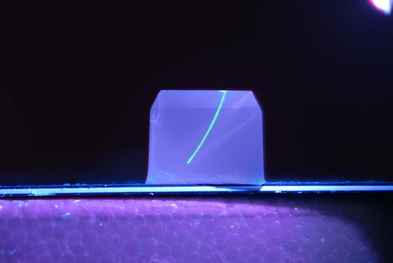 Better understanding and treating brain disease requires the use of complex tools to investigate its activity. Current devices are often bulky and damage the brain, but this damage and scarring can be minimized by implanting smaller devices, like a microcapillary. Polishing flexible microcapillaries to specific angles causes them to curve due to net forces upon implantation. This allow the implant to avoid important structures and reach a desired target like a brain tumor or seizure focus. Here we demonstrate the use of steerable glass microcapillaries to investigate and treat structures deep within the brain. This image is part of a series of tests that were done to rigorously characterize the curvature of bevel-tipped microcapillaries in different stiffness agarose gels and brain tissue.