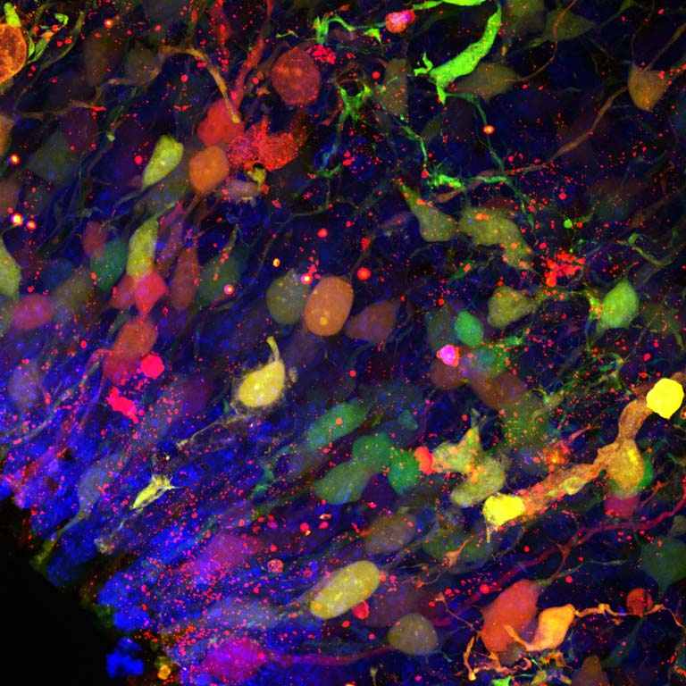 This image presents a snapshot of immature brain cells as they grow, divide, and migrate through the developing brain. With these images, we were trying to determine if cells that are related to one another stay close together throughout brain development.