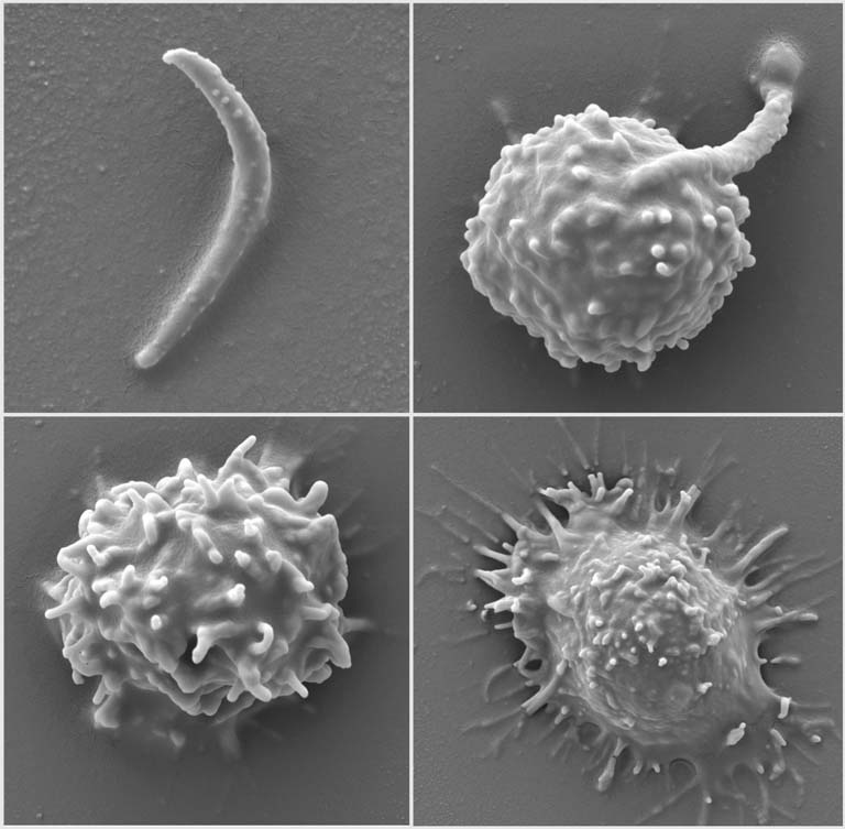 These images show malaria sporozoites interacting with a human natural killer (NK) cells directly, as well as NK cells in various states of activation in response to the parasite. These interactions are dependent on antibodies that recognize the sporozoite and promote NK cell activation and function.