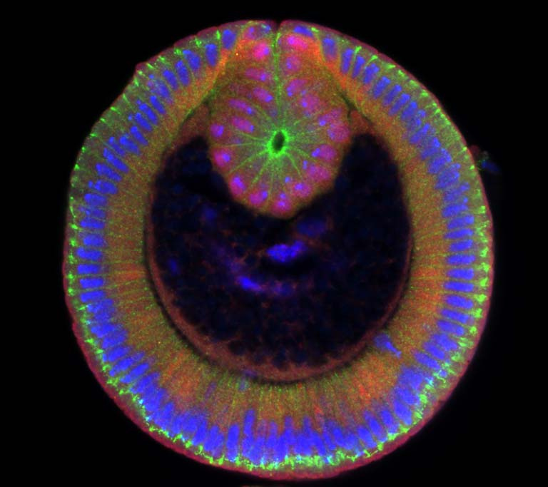 We study how a group of cells is coordinated in order to together create a new shape, i.e. which cell has to create how much mechanical force, and when. During development, this process determines the correct shape of organs and, if misguided, can lead to common birth defects, e.g. Spina bifida in humans.