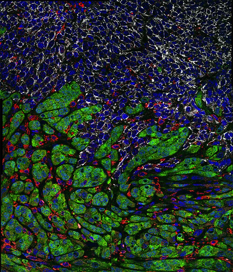This image represents a mixture of different types of breast cancer cells residing within a tumor and their interaction with immune cells. Most breast tumors are comprised of breast cancer cells along with cells of the immune response. These immune cells greatly influence the ability of breast tumors to spread to distant sites of the body. In this image one can observe a specific subset of immune cells called macrophages in red, interacting with two different types of breast cancer cells depicted in white and blue. The macrophages are found in larger numbers in the mesenchymal (green) section of the tumor relative to the epithelial (white) sections in the same tumor.