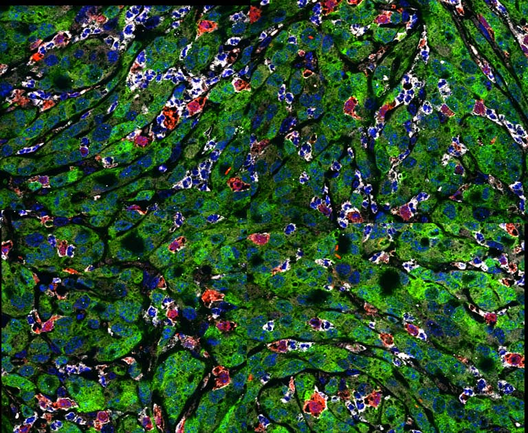 This image represents the interaction of breast cancer cells with immune cells. Most breast tumors are comprised of breast cancer cells along with cells of the immune response. These immune cells greatly influence the ability of breast tumors to spread to distant sites of the body. Paradoxically, some mmune cells help the tumor grow instead of curbing its growth! These specialized immune cells are called as “immunosuppressive” cells and can be found in large numbers in tumors. In this image one can observe a specific subset of immunosuppressive cells called the M2-macrophages (white border expressing red immunosuppressive enzyme) interacting with mesenchymal cancer cells in green.