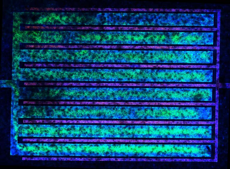 We are creating implantable chips in order to implant engineered cells in human patients. These cells will act as factories to manufacture and deliver the right amount of drug when needed. Shown here is an advanced version of the chip carrying two kinds of cells in an intricate pattern. The cells shown in green produce the drugs while the red cells provide support for growth of the green cells. We design the cell patterning to ensure these two cell populations can communicate with each other for desired function within the device.