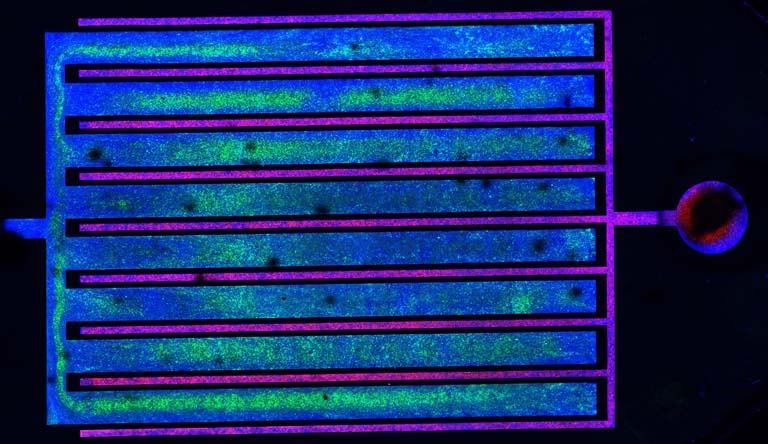 We are creating implantable chips in order to implant engineered cells in human patients. These cells will act as factories to manufacture and deliver the right amount of drug when needed. Shown here is an advanced version of the chip carrying two kinds of cells in an intricate pattern. The cells shown in green produce the drugs while the red cells provide support for growth of the green cells. We design the cell patterning to ensure these two cell populations can communicate with each other for desired function within the device.