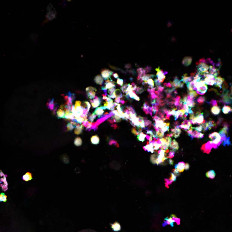 The image depicts very specialized of immune cells, called dendritic cells, as they move inside the tumor of a living mouse. These images were taken as a time series over 30 minutes. Time has been encoded as colors in an overlay. Immobile parts of the dendritic cells are white while cell movements are shown as different colors, depending on their exact timing.