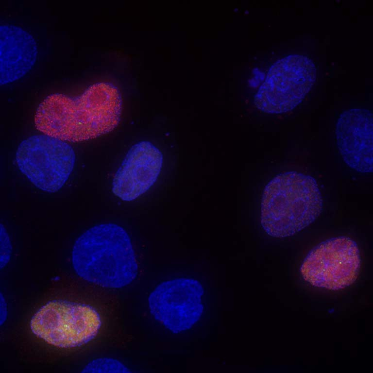 The image shows the nucleus of more than ten cells. The chromatin inside each nucleus is shown in blue. Some cells were transfected with a small DNA expressing a fluorescent reporter in which each of two gene expression pathways expresses different fluorescent proteins. Proteins expressed from this small DNA can be green or red depending on the expression pattern in each cell. Green cells express one expression pathway while red cells express the other. Every color in the middle represent a cell with different proportion of the gene expression pathways.