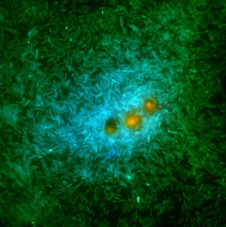 These images visualize the metabolic interaction between live bacteria and phytoplankton in the ocean. Symbiodinium cells (in orange) are single-cell, photosynthetic organisms that live in the ocean. Marine phytoplankton, such as Symbiodinium, exude metabolites into their surroundings that marine bacteria (in green and cyan) utilize as nutrients. One such Symbiodinium-derived metabolite is called DMSP (dimethylsulfoniopropionate). Phytoplankton such as Symbiodinium produce more than one billion tons of DMSP each year, and DMSP is a precursor of a gas (dimethylsulfide, or DMS) that is implicated in the formation of clouds.