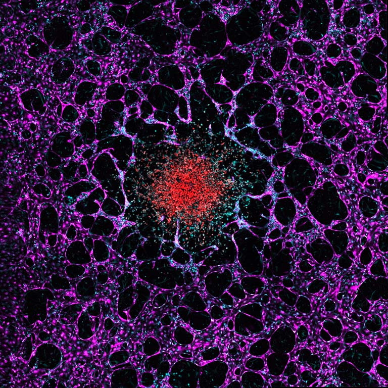 The image depicts a typical tumor spheroid (model for cancer) cultured within a bed of 3D micro-capillaries. The presence of the tumor contributes to increased cell death and reduced vessel density in its proximity, demonstrating the difficulty in effective transport of chemotherapeutic drugs in this complex microenvironment.