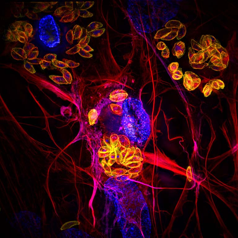 The skeleton of the human cell (in this case a protein called actin) can be seen in red, occasionally wrapping around the replicating parasites. Individual parasites, only about 0.005 mm long, are illuminated in yellow or magenta. In some of these parasites, Toxoplasma has been caught in act of building two daughters which will later burst out of the mother.