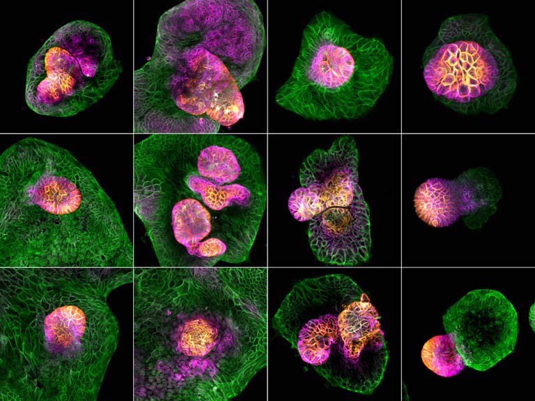 Cells in our body live in 3D. Cells isolated from the intestine “remember” their original environment and spontaneously form 3D structures when expanded in the lab. We are interested in understanding how intestinal stem cells undergo morphogenesis. Using our synthetic matrix, we can create complex 3D cellular architecture (shown in this image) starting from a single human intestinal stem cell. Our research shows that by providing some initial cues, intestinal stem cells can form 3D structures that resemble native tissue.