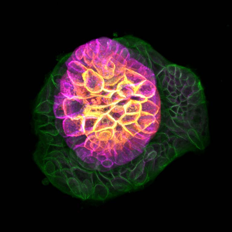 Cells in our body live in 3D. Cells isolated from the intestine “remember” their original environment and spontaneously form 3D structures when expanded in the lab. We are interested in understanding how intestinal stem cells undergo morphogenesis. Using our synthetic matrix, we can create complex 3D cellular architecture (shown in this image) starting from a single human intestinal stem cell. Our research shows that by providing some initial cues, intestinal stem cells can form 3D structures that resemble native tissue.