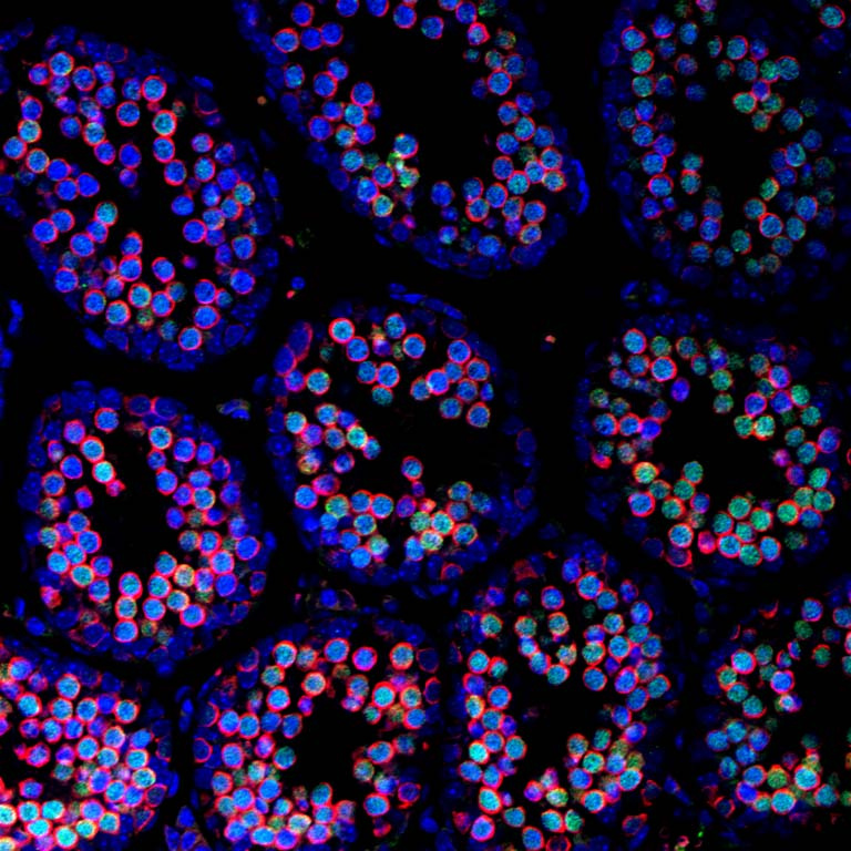 This is a cross-section of a juvenile mouse testis, with cells that are on their way to becoming mature sperm. Spermatogenesis takes ~35 days in mice, and one important process that happens during spermatogenesis is “meiosis,” a special cell cycle that helps generates cells with half the amount of DNA. Shown here is a high enrichment of cells that are undergoing meiosis; the green labeling depicts a special “chromosome dance” that happens during meiosis.