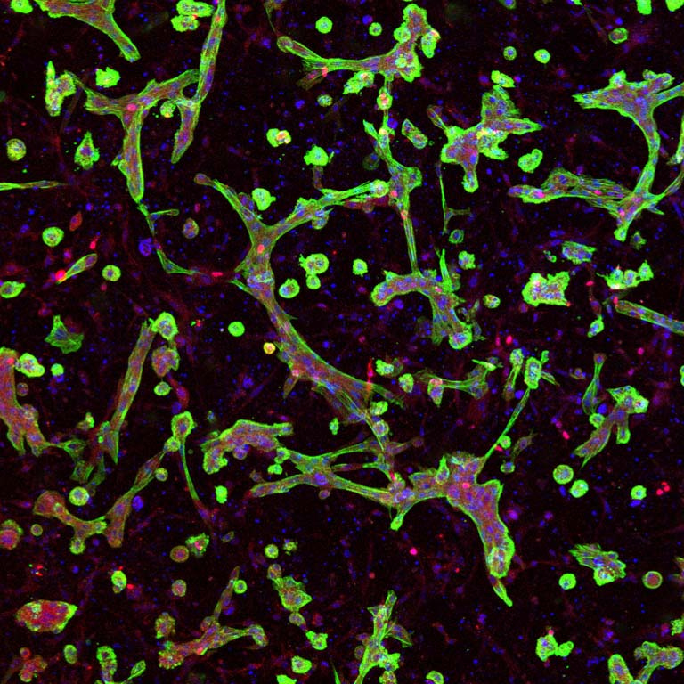 Our image demonstrates how cardiomyocytes derived from these stem cells can be used to study cell-cell interactions. Shown here are neo-structures that emerge following a week-long culture of endothelial cells with cardiomyocytes in a 3D gel. Endothelial cells line all our blood vessels and are pervasive throughout our body and particularly in our heart. Studying the interaction of these two cell types is important as they both play significant roles in development and maintenance of this important muscle.