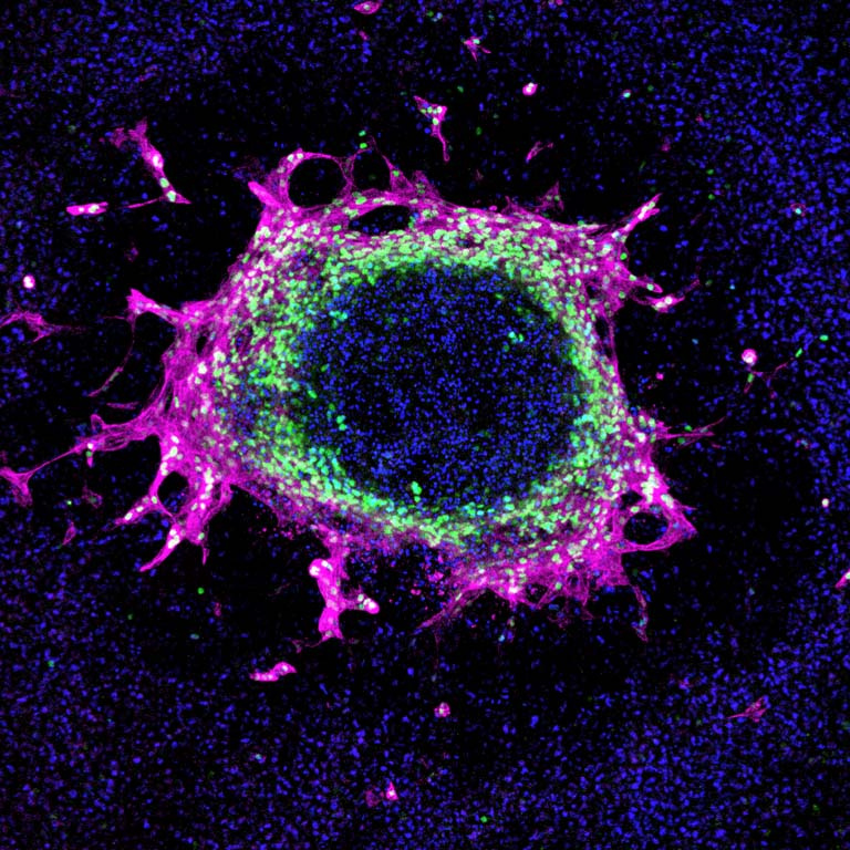 Our image demonstrates how we can employ these naïve stem cells to generate populations of cardiomyocytes. These cells form complex emergent structures as they develop into mature cardiomyocytes.