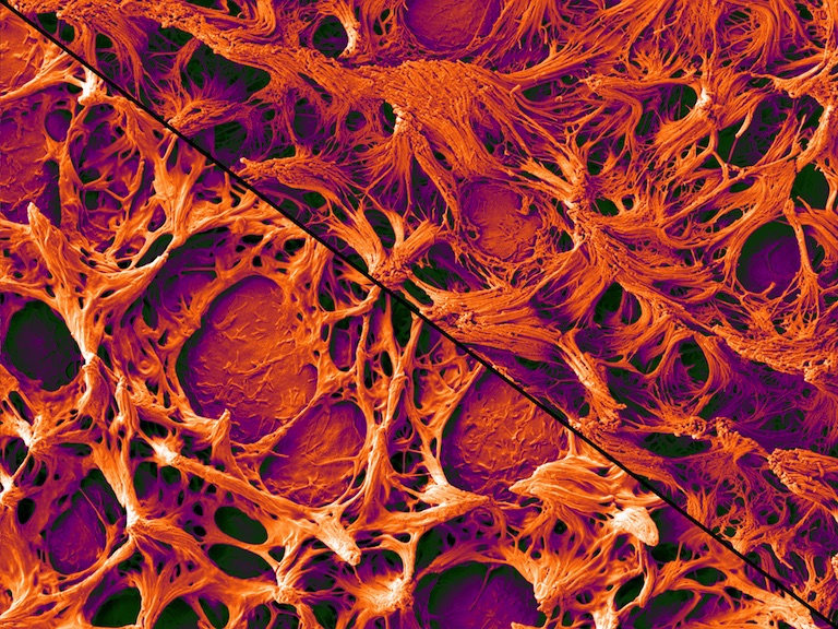 Cilia are small hairs that line the inside of our lungs and help keep them clear of dust and debris. These images show cilia grown in a specially designed cell culture dish. The functional cilia are more densely packed and longer (upper right), while the dysfunctional cilia are shorter and do not fully cover the layers underneath (lower left).