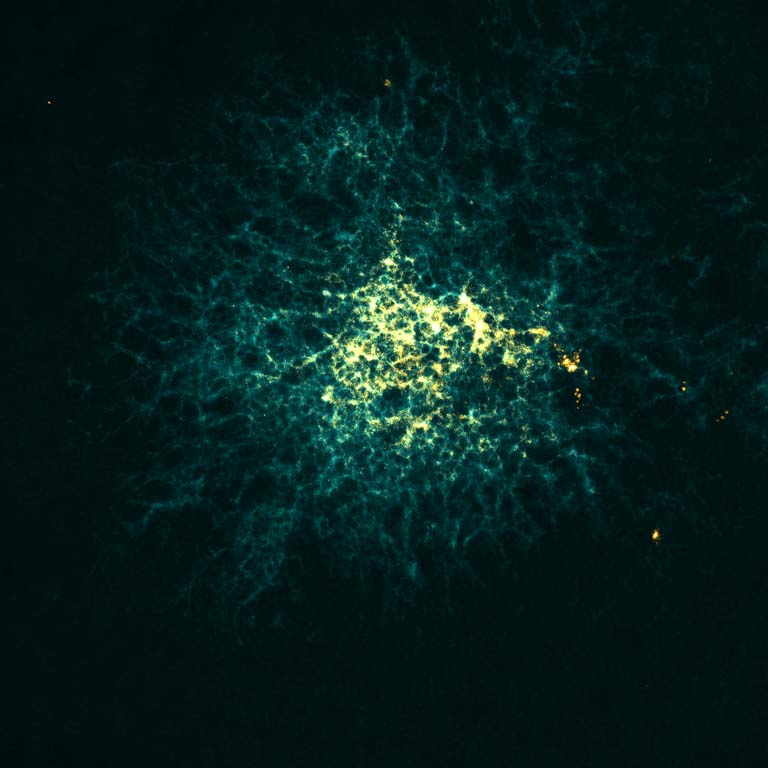 This image shows part of a germinal center, the training ground of the immune system. The wider spread that can be seen are cells (follicular dendritic cells) that display foreign materials so other elements of the immune system can test if they can recognize the specific foreign substance. The color concentrated more in the center is a small protein nanoparticle (ferritin) that has been coated in mannose, a simple sugar, which causes the particle to traffic rapidly to follicular dendritic cells as part of a newly elucidated mechanism.