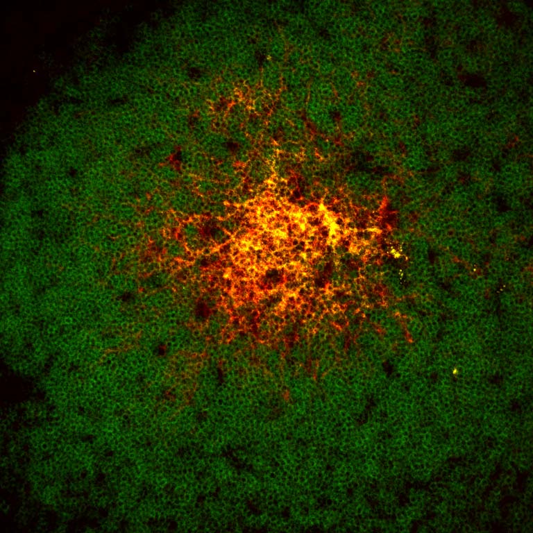 This image shows part of a germinal center, the training ground of the immune system. The wider spread that can be seen are cells (follicular dendritic cells) that display foreign materials so other elements of the immune system can test if they can recognize the specific foreign substance. The color concentrated more in the center is a small protein nanoparticle (ferritin) that has been coated in mannose, a simple sugar, which causes the particle to traffic rapidly to follicular dendritic cells as part of a newly elucidated mechanism.