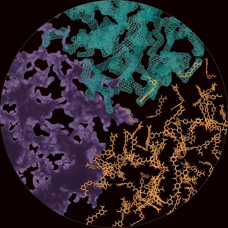 This image is a juxtaposition of a molecular dynamics simulation and an electron microscopy image of the anti-cancer drug sorafenib. Sorafenib and many other drugs can spontaneously form self-assembled, intricate nanostructures, which dramatically changes how the drug will behave in experiments and, even more importantly, affect patients. By understanding and simulating the underlying mechanisms of such nanostructure assembly, we enable the use of artificial intelligence to rapidly predict the effect of millions of possible adjuvants, solvents, and chemical modifications on such aggregations. With the help of smart algorithms, we can then focus our experimental testing only on the most promising candidates and thereby quickly identify new formulations and treatments with improved delivery and efficacy.