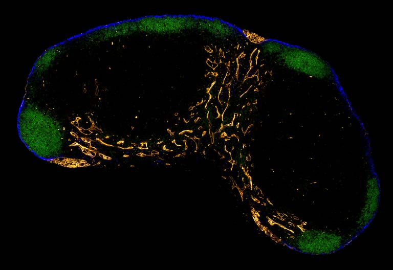 This image shows the exquisite cellular organization of lymph nodes where antigen sensing macrophages line the exterior barrier of the lymph node and B cell follicles and lymphatic vasculature lie in discrete inner compartments. We are trying to analyze if lymphatic flow is altered following immune activation.