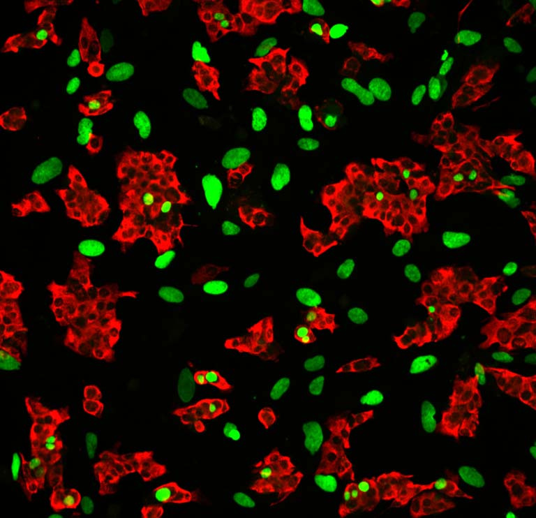 As part of the Chemical Biology and Therapeutics Science of the Broad Institute we are focused on using Chemical biology approaches to identify small molecules that can mitigate or treat Diabetes. Among that we are interested to identify novel small molecules that induce beta-cell proliferation. Pancreatic beta-cells do not proliferate. We were able to identify compound that are able to induce beta-cells to proliferate opening novel avenues for the treatment of Diabetes. Among the various beta-cell (in Red) some are proliferating as identified by small green nuclei.