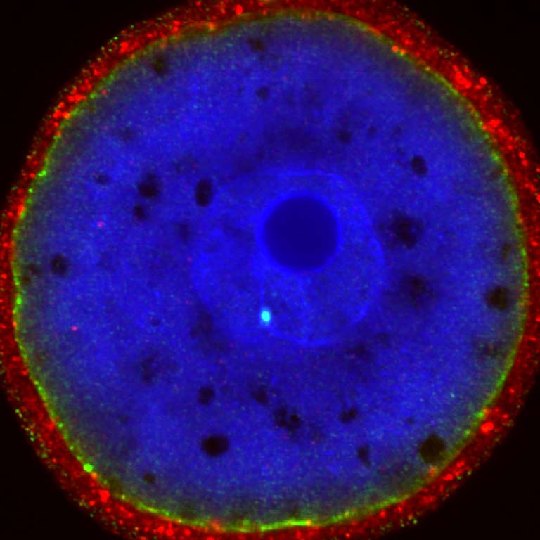 This image captures the moment when a one-cell mouse embryo is undergoing a CRISPR/Cas9-induced gene editing event. The cell is outlined in a stem cell marker called SSEA1 (red) and the bright green dot highlights an accumulation of a protein called RAD51, which marks the exact location where the gene editing event is happening.