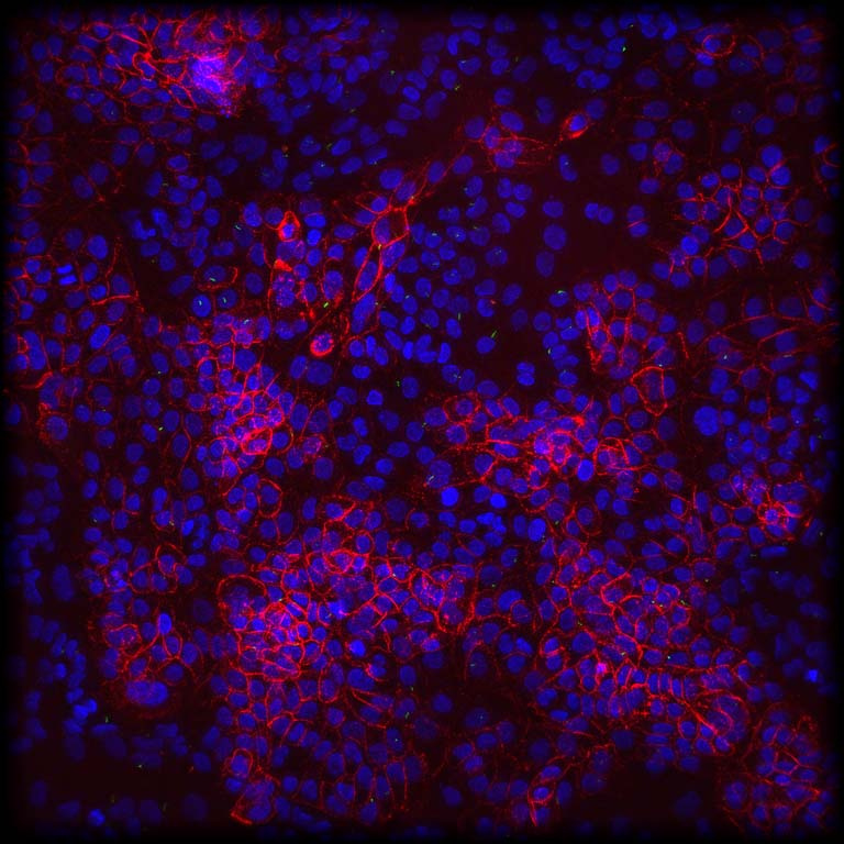 Primary tumors arising from any tissue type comprise a heterogenous population of cells. Within this population, only a subset of tumor cells maintains the ability to form a new tumor, and are referred to as tumor-initiating cells. These images are taken of breast cancer cells grown in a tissue culture dish. In the context of breast cancer, we have identified that some tumor cells harbor the ability to form primary cilia (the tail-like structures labeled in green), which act as scaffolds for molecular programs that drive tumor formation and progression. We also observe that some tumor cells maintain an epithelial appearance (meaning that they form adhesions with other cells, and are less migratory), and will stain positively for the epithelial marker E-cadherin (in red). However, other tumor cells gain a more mesenchymal appearance, meaning that they lose those cell adhesions (lose red staining), are more migratory, and are more likely to be able to metastasize to other organs in an in vivo setting. This loss of epithelial properties and gain of mesenchymal, migratory properties is referred to as the epithelial-mesenchymal transition (EMT). We want to understand the relationship between primary cilium-dependent programs and EMT in breast cancer formation and metastasis.