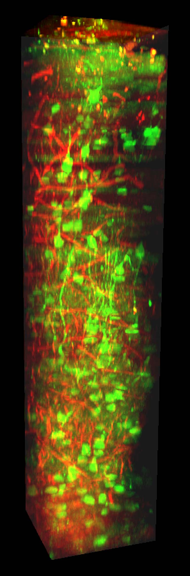 In mammalian brain, visual information acquired from the environment is processed in the primary visual cortex (V1). V1 has six layers and each of these layers have different functions in terms of processing the visual information. In most of the mammal’s brains such as human, primates, and cats, neurons standing in the same layer have similar responses to the same visual stimulus. However, it has been shown that neurons in the superficial layers of the mouse brain have different responses to the same visual stimulus even though they are standing in the same layers. Still, there is a mystery whether neurons in the deep layers of V1 has similar or different responses to the same stimulus. Thus, I developed a home-made microscope which can allow us to image deep layer neurons in V1 of awake mice while we present visual stimulus to the mice. In this image, red color represents blood vessels and green color represent the neurons in all layers of the cortex spanning from superficial (top) to deep layers (bottom) which have similar responses to the same visual stimulus