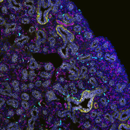 The organized development of vasculature is broadly important in the retina and other tissues, but is also an important component of cancer as the tumor creates its own network of vessels to fuel its growth and metastasis. During both developmental and pathological angiogenesis, the endothelial cells that form the walls of blood vessels make contacts with and receive signals from the surrounding extracellular matrix (ECM) in their microenvironment. This promotes and controls their growth and migration. We took this image of a retina to visualize the vasculature and underlying ECM. We want to better understand how specific ECM proteins that organize into a fibrous meshwork beneath the developing vessels guide the growing vessel network and promote proper angiogenesis.
