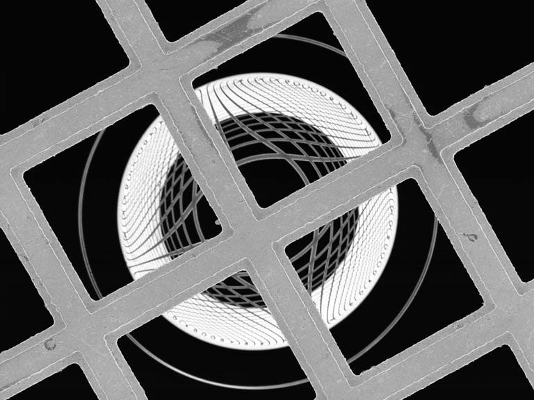 This is a scanning electron micrograph of a micron-sized copper grid (foreground) and its distorted and demagnified reflection (background) through a concave electron mirror. As a part of my research into means of achieving nanometer-resolution images of biological samples while reducing beam-induced damage, I design and construct electron mirrors inside a scanning electron microscope.
