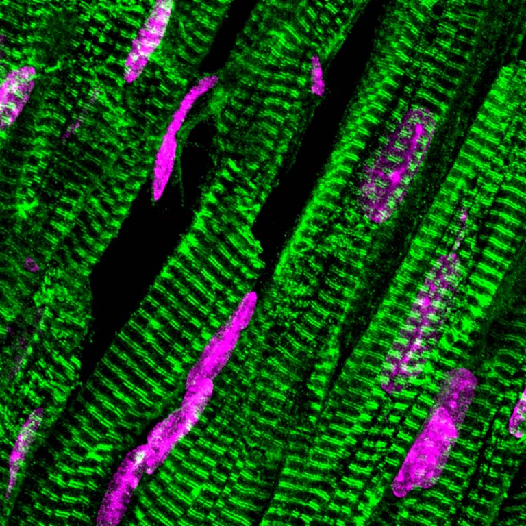 This image was taken from a slices of adult mouse heart tissue. For heart tissue we modified a relatively new technique called expansion microscopy. Expansion microscopy involves embedding the tissue within a hydrogel and then swelling the gel, which expands the tissue. The increase in the size of the tissue allows for super resolution images to be taken on diffraction limited microscopes. Cardiac troponin is colored in green to visualize the sarcomere and nuclei in magenta.