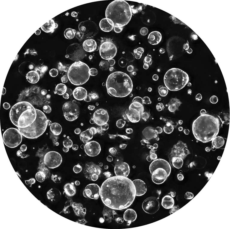 These are images of miniature organs (organoids) derived from stem cells of the intestine, and grown together with CRISPR engineered cancer organoids. This platform allows us to directly compare normal intestinal stem cells with pre-malignant adenomas.