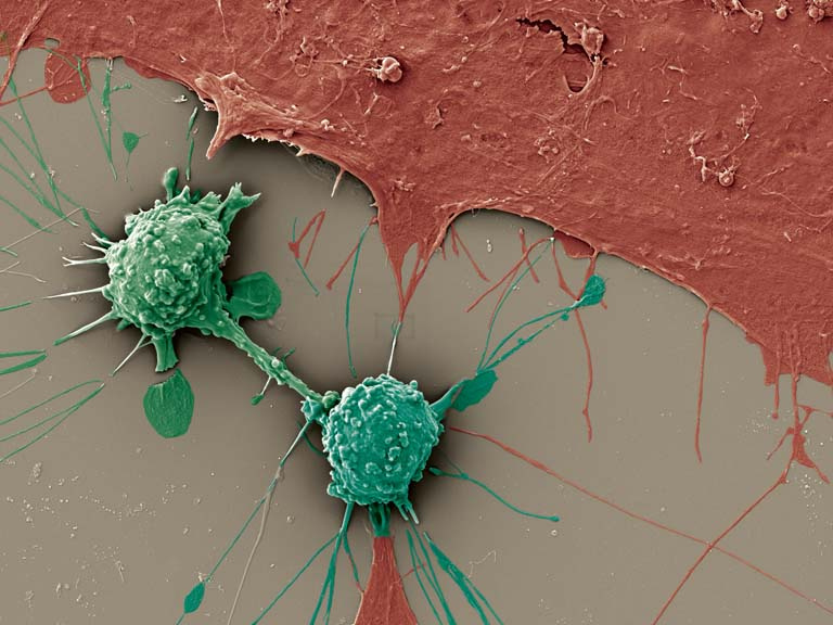 In these images, you can see the immune cells (green) trying to attack the transplant cells (red). However, because we have put the biological equivalent of an invisibility cloak around the transplant cells, they remain unbothered.