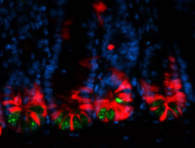 The image shows a small piece of a mouse intestine. Intestinal stem cells are located at the bottom of structures called ‘crypts’ and they are responsible to generate all the other cells in the intestinal epithelium. The red-color cells represent all the cells generated from the intestinal stem cells for a period of two days. The green granules are components of the Paneth cells, which are cells located in between the stem cells, also in the crypts, to support their function. The nucleus of every single cell in this region is shown in blue.