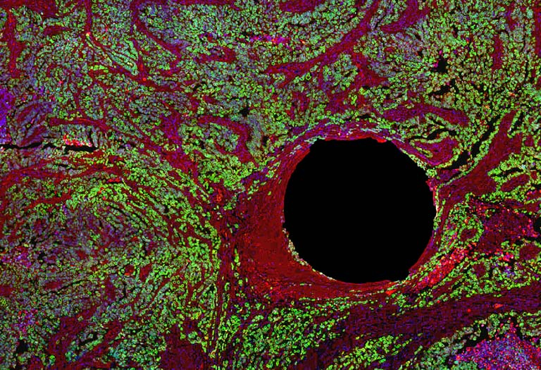 This image is a combination of fluorescent labels to visualize and quantify the effects of chemotherapy on tumors derived from human ovarian cancer patients. A microdevice is loaded with small doses of chemotherapy and implanted in a tumor. The tumor is removed and the cells around the device are analyzed to understand which chemotherapies work best in that tumor type with its unique mix of cancer and healthy cells. This technique can be used in patients to personalize their treatment to what will work best for their tumor. In this image green represents tumor cells, blue represents surrounding cells, and red represents dead tumor cells where chemotherapy was released.