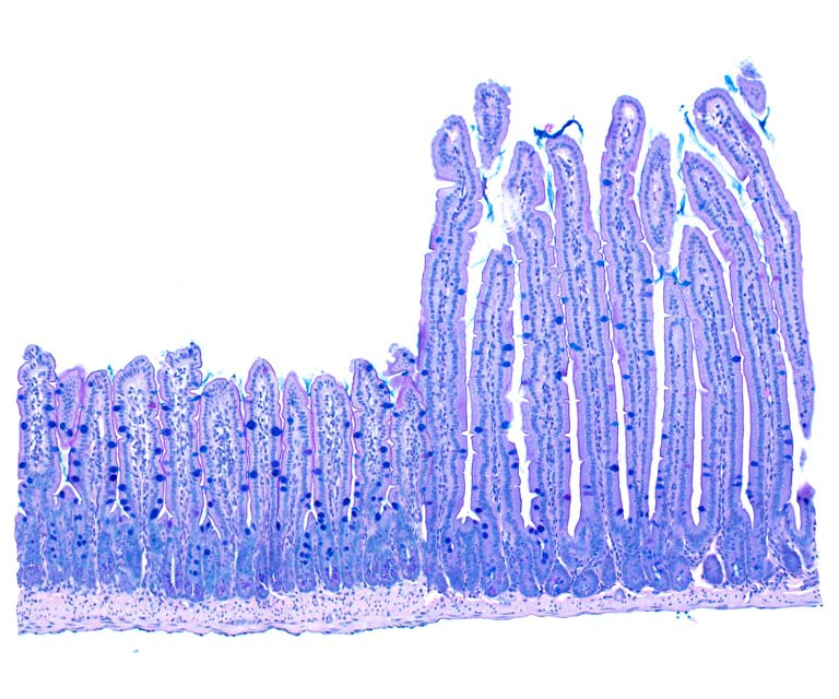 Environmental enteropthy, which afflicts many children in the developing world who lack access to proper food sources, is associated with decreased IQ and increased risk of gastrointestinal infections, which do not correct even when placed on a normal diet. We are studying this disease in a mouse model, and combined nanotechnology with intestinal stem cell expertise to engineer nanoparticles which when eaten, induce the stem cells to grow and correct the histological phenotype. These images capture that initial disease state and the change when fed these new nanoparticles.