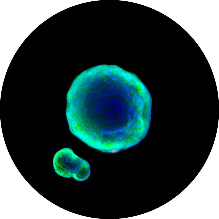 The laboratory specializes in growing gastrointestinal stem cells, and organoids are a new model to study their behavior outside of the body. We took these images in general to identify their growth characteristics and overall morphology. By growing the organoids, we can study the effects of drugs, cytokines or nutrients on their function. The image shows that we can generate organoids from individual human patients afflicted by cancer to test new chemotherapies to provide individualized patient testing for cancer treatment.