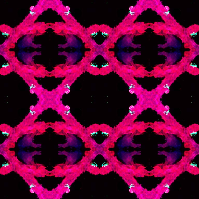 These images show a few specialized immune cells, called dendritic cells (in green), sticking to and interacting with a bunch of tumor cells (red/purple), all of them embedded in a gel so they can move around and grow in 3D. These experiments showed that some dendritic cells (the ones visible here) stick to the tumor cells very well and can even squeeze between them. This is a behavior that is not understood or observed often by immunologists so it is exciting to see it outside of the body.