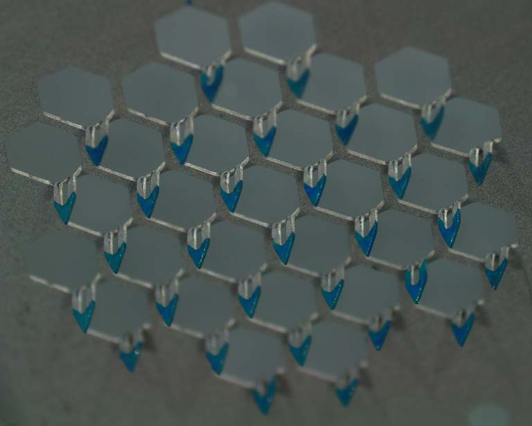 Seen here are microneedle-based skin patches for transdermal drug delivery and longitudinal sampling of cells and interstitial fluid, enabling minimally invasive parallel monitoring of immune responses. We took the image to assess the attachment of the bioactive coating on the microneedles surface. By having a well-attached coating, we will be able to deliver bioactive reagents in a more efficient way.