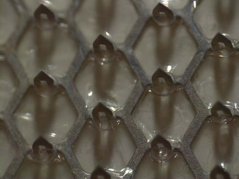 Seen here are microneedle-based skin patches for transdermal drug delivery and longitudinal sampling of cells and interstitial fluid, enabling minimally invasive parallel monitoring of immune responses. We took the image to assess the attachment of the bioactive coating on the microneedles surface. By having a well-attached coating, we will be able to deliver bioactive reagents in a more efficient way.